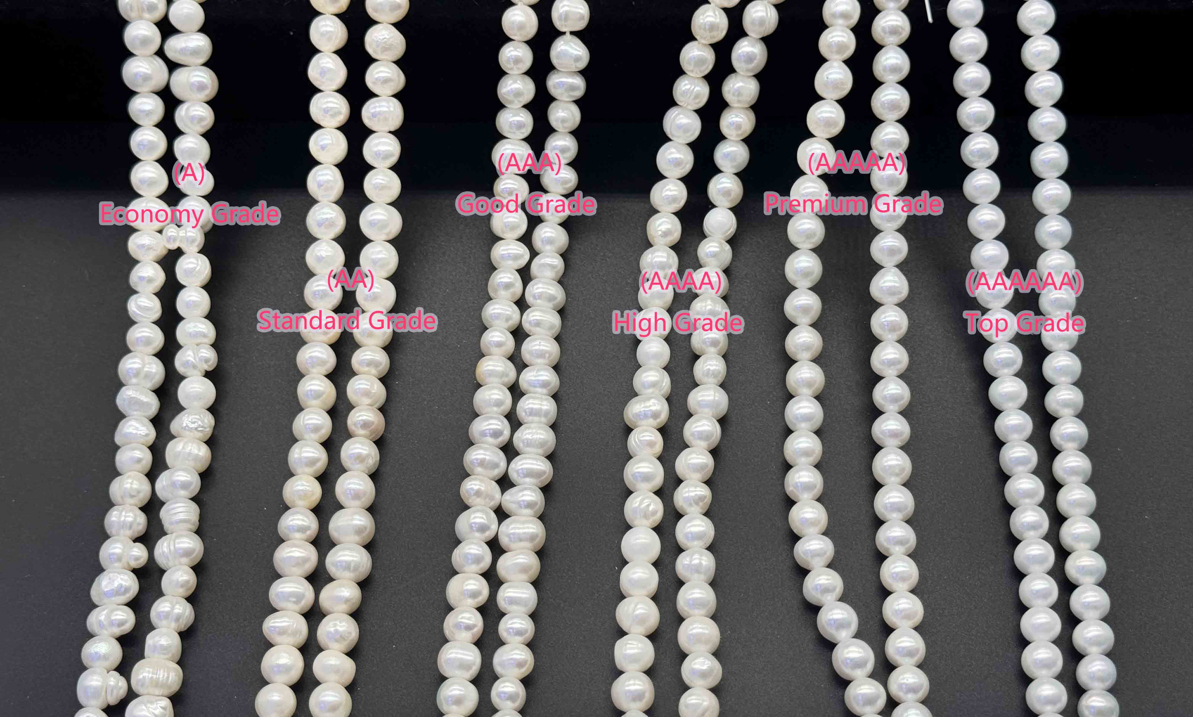 Grade A (Economy Grade):Medium to low luster,Obvious natural flaws,Slightly irregular shape,For bulk quantity & low-budget jewelry